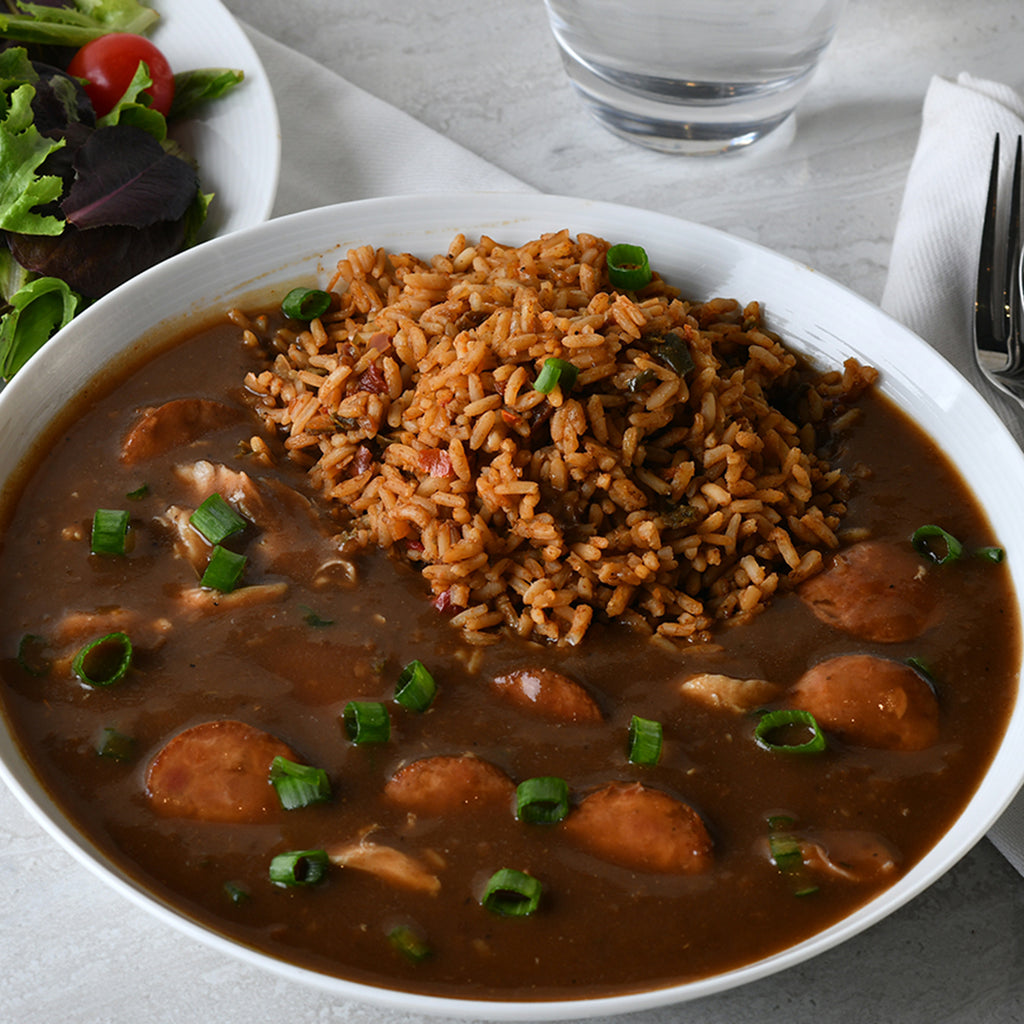 Gumbo Recipe Ingredients are packaged in a shelf stable sealed bag that includes a dark rich roux, a flavorful rich stock, Louisiana trinity of vegetables and seasonings. Add chicken and sausage or seafood for a tasty New Orleans meal.